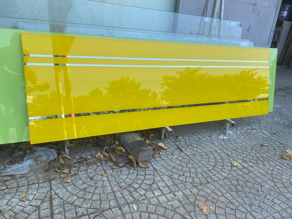 • Kính Ốp Bếp Sơn Màu: Đây là loại phổ biến nhất. Kính ốp bếp sơn màu được làm từ kính cường lực 8mm, sau đó được sơn phủ một lớp sơn chuyên dụng ở mặt sau. Quy trình gia công kính này đảm bảo màu sắc đồng đều, bền đẹp và không bị trầy xước trong quá trình sử dụng. Bạn có thể dễ dàng chọn màu theo phong thủy, sở thích hoặc màu sơn tường để tạo nên một tổng thể hài hòa.