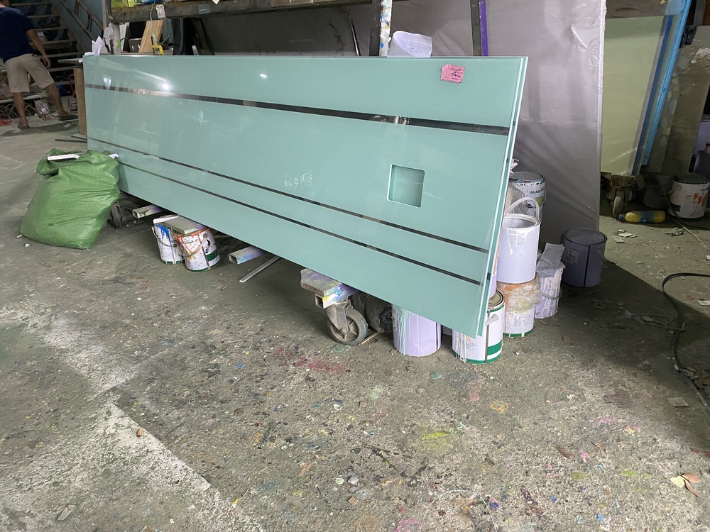 Bước 2: Gia Công Kính Sau khi có kích thước chính xác, kính cường lực (thường là kính 8mm) sẽ được cắt, mài cạnh và khoan khoét các lỗ (để lắp ổ điện, công tắc) tại xưởng. Kính sau đó được làm sạch và sơn màu theo yêu cầu của khách hàng. Quá trình sơn kính được thực hiện bằng công nghệ chuyên dụng, đảm bảo lớp sơn bám dính tốt và đều màu.